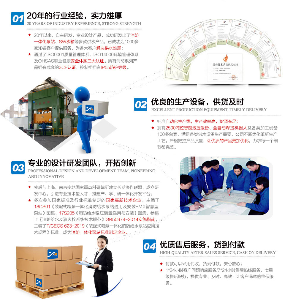 我公司以產品為導向與國家重點科研院所建立長期協作聯盟,成立了研發(fā)中心并先后開發(fā)了幾十個專利項目,抗浮箱泵一體化成套設備等多個產品被列為江蘇省高新技術產品。主編的...